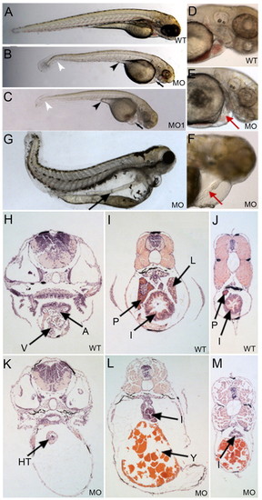Gata4 deficient embryos develop cardiac and gut tubes but no derivative organs. (A-C) Shown at 3 dpf are (A) a representative control embryo (WT), and embryos derived from eggs injected with (B) the morpholino targeting the Gata4 5'UTR (MO) or (C) the morpholino targeting an intron/exon boundary (MO1). The morphant fish display a kink in the tail (white arrowheads), a pericardial edema (black arrows), and regression of the yolk stalk extension (black arrowheads). (D,E) Control embryo (D) and a representative morphant (E), showing a relative lack of blood in the linear but constricted heart tube at 3 dpf in the morphant (red arrow). (F) At 5 dpf, the morphant linear heart tube (red arrow) is distended. Views are lateral, dorsal to the top and anterior to the right. (G) At 8 dpf, a linear gut tube is shown (arrow), running the length of the morphant body. (H-M) Representative histological cross sections through control (WT) or morphant (MO) embryos. Equivalent sections are progressively more caudal, at the level of the heart (H,K), mid-pancreas (I,L) or the caudal end of the swim bladder (J,M). A, atrium; V, ventricle; HT, heart tube; P, pancreas; L, liver; I, intestine; Y, yolk. |