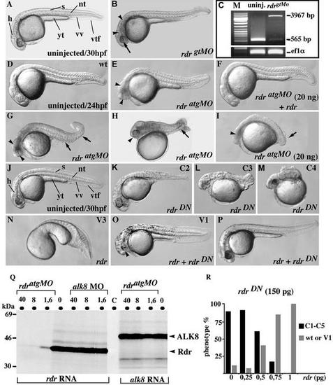 Loss-of-Mrdr function specifically results in dorsalized phenotypes. (A and B) Live embryos at 30 hpf, either uninjected (A) or injected with rdrgtMO (10 ng; B) showing all characteristics of rdrΔ1 zygotic mutant haploids, including reduced eyes (arrow) and neural cell death (arrowheads). (C) RT-PCR products of transcripts from uninjected and rdrgtMO-injected embryos using primers amplifying the region of the targeted splicing event were run on a 3% agarose gel. The morphant PCR product has the expected size (3,967 kb) and sequence of a transcript retaining intron 1. ef1α amplimers are shown as reverse transcription quantitative controls. (D–P) Live embryos at 24 hpf (D–I) and 30 hpf (J–P) either uninjected (D and J) or injected (E–I and K–P) with the MOs/mRNAs described in each right lower corner. Unless stated otherwise, doses used per embryo were rdr (1 pg), rdrDN (150 pg), and rdratgMO (15 ng). Arrowheads and arrows in E and G–I denote ZrdrMO and MrdrMO features, respectively. (K–M) C2–C4 dorsalized rdrDN-injected embryos. (N and O) V3 (strong) and V1 (mild) ventralized embryos. Arrowhead in O marks the V1-characteristic reduced eye size. All views are lateral, anterior to the left. h, head; s, somite; nt, notochord; yt, yolk tube; vv, ventral vein; vtf, ventral tail fin. (Q) rdratgMO specifically blocks rdr mRNA but not alk8 mRNA translation in vitro. rdr (Left) or alk8 (Right) mRNAs (1 μg) were translated in vitro in the presence of rdratgMO or alk8MO at the indicated concentrations (40, 8, 1.6, or 0 μM), then translation products were resolved. (C) No mRNA added in the translation reaction. (P and R) Rescue of rdrDN phenotypes with rdr mRNA. |