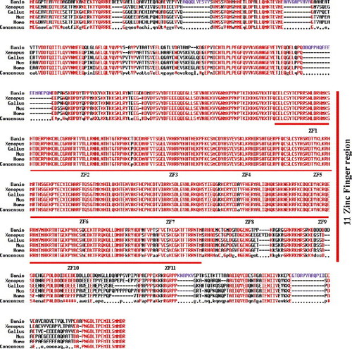 Multiple alignment of CTCF proteins. The amino acid sequences of zebrafish (Danio; GenBank accession No. AY547282), chicken (Gallus; GenBank accession no. Z22605), human (Homo; GenBank accession no. HSU25435), mouse (Mus; GenBank accession no. U51037) and Xenopus (Xenopus; GenBank accession no. AF305695) CTCF were aligned using the MultAlin computer program (http://prodes.toulouse.inra.fr/multalin/multalin.html). Identical amino acids are marked in red. Dashes indicate absence of alignment. The unique zebrafish amino acid regions are marked in purple. |