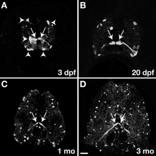 Transverse sections of spinal cords of Tg(olig2:egfp) transgenic zebrafish, dorsal to top. Strong EGFP fluorescence was evident in ventral cells with radial processes extending to the pial surface at all stages (arrows). A: At 3 dpf, other EGFP+ cells had multiple fine membrane processes and occupied positions characteristic of OPCs (arrowheads). B-D: The number of EGFP+ radial cells in transverse sections remained constant at all stages examined through 3 months whereas the number of non-radial EGFP+ cells increased throughout the spinal cord. Scale bar = (A) 20 μM; (B) 30 μM; (C) 50 μM; (D) 80 μM. |