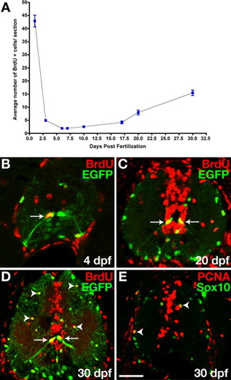 olig2+ spinal cord cells divide at postembryonic stages. All images are single confocal optical sections of transverse sections of 30 dpf Tg(olig2:egfp) zebrafish spinal cords, dorsal up. A: Graph showing average number of BrdU+ spinal cord cells per transverse section at different embryonic and postembryonic stages. Data were compiled from 15-30 sections per timepoint. Bars represent standard error of the mean. B: 4 dpf Tg(olig2:egfp) transgenic larvae pulse-treated with BrdU and labeled with anti-BrdU antibody. Arrows indicate EGFP+ radial glia, which incorporated BrdU. C,D: Twenty- and 30-dpf Tg(olig2:egfp) transgenic fish treated with BrdU repeatedly. Many cells, including EGFP+ radial glia (arrows), bordering the central canal and medial septum incorporated BrdU. Some EGFP+ oligodendrocyte lineage cells were also BrdU+ (arrowheads). E: Double labeling with anti-Sox10 and anti-PCNA antibodies. Sox10+ PCNA+ cells were proliferative OPCs (arrowheads). Scale bar = 30 μM (B,C), 50 μM (D,E).