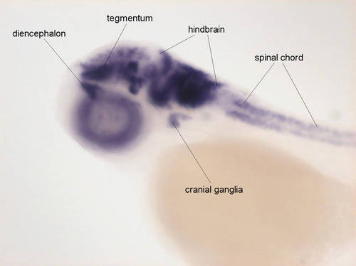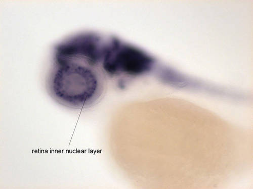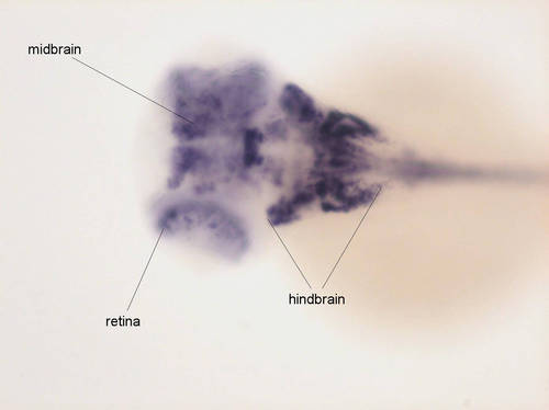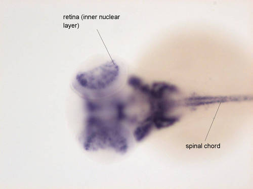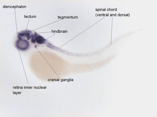 Expressed in retina inner nuclear layer, in diencephalon in tegmentum in tectum, in hindbrain in ventral and dorsal part of the spinal chord and in cranial ganglia |