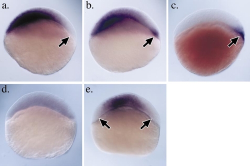 zbmp2b is ectopically expressed in pregastrula boz mutants. Analysis of zbmp2b expression in wild-type and homozygous bozm168 mutant embryos prior to the onset of gastrulation. All embryos are oriented with animal pole toward the top and dorsal to the right. (a) In wild-type embryos prior to the onset of gastrulation at 40% epiboly stage, zbmp2b transcripts are not detectable on the dorsal side of the embryo. The region free of zbmp2b message is complementary to the dorsal blastoderm region that expresses nieuwkoid/dharma, shown for reference in a slightly younger wild-type embryo (c). (b) In contrast, zbmp2b transcripts do not clear completely from the dorsal margin in homozygous bozm168 mutant embryos and the persistent zbmp2b expression is also detected in the dorsal YSL. (d and e) Misexpression of nieuwkoid/dharma RNA is sufficient for the down regulation of zbmp2b expression in wild-type pregastrula embryos. (d) Embryo injected with nieuwkoid/dharma RNA in both blastomeres at the two-cell stage and assayed for zbmp2b expression at 40% epiboly stage. zbmp2b expression is strongly reduced throughout the entire blastoderm. (e) zbmp2b expression at 40% epiboly in wild-type embryo injected with nieuwkoid/dharma RNA in two distant blastomeres at the eight-cell stage. Ectopic and expanded regions of zbmp2b repression are observed (arrows). |