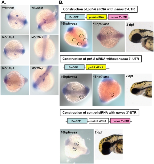 The puf-A gene plays a role in the PGC development in zebrafish embryonic development. (A) The vasa antisense riboprobe was used in whole-mount in situ hybridization as a marker to monitor primordial germ-cell (PGC) development in zebrafish. The vasa expression in wild-type (WT) and morphants (MO1 at 5 ng/embryo) at 16 and 20 hpf embryos in dorsal view. Anterior is to the left for 16 hpf and left bottom for 20 hpf. The morphants exhibited prominent abnormalities with either a reduction in PGC numbers (50.4%, n = 125 embryos) or abnormal patterns of migration (34.4%, n = 125) indicating the failure of PGC navigation towards their destined sites. (B) Upper: the construction of puf-A siRNA with nanos 3′ UTR, vasa expression and normal eye size in embryos 2 dpf after injection. The embryos displayed a marked reduction in PGC numbers (80.9%, n = 115 embryos) and abnormal patterns of migration (11.3%, n = 115 embryos). Middle: construction of puf-A siRNA without nanos 3′ UTR, vasa expression and small eye size in 2dpf embryos. Bottom: construction of control siRNA with nanos 3′ UTR, vasa expression and normal eye size in embryos after injection.