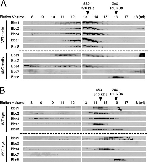 BBSome is not formed in Bbs6 null mouse tissues. (A) Wild-type (WT) and Bbs6 null (6KO) mouse testis extracts were fractionated by size exclusion chromatography. Elution fractions were subjected to SDS/PAGE and immunoblotting. Membranes were probed with antibodies against Bbs1, Bbs2, Bbs4, Bbs7, and Bbs8. (B) Extracts from wild-type and Bbs6 null eye were analyzed as in A. Open arrowhead indicates Bbs1; closed arrowhead indicates a cross-reacting protein. It should be noted that Bbs1 blot from Bbs6 null eye was exposed longer than that of wild-type. |