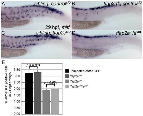 Numbers of mitfa-expressing cells are equivalent in tfap2a/e doubly-deficient and tfap2a deficient embryos. (A–D) Lateral trunk views of 29 hpf embryos of the indicated genotypes, injected with either control MO or tfap2e e3i3 MO, as indicated, and processed to reveal mitfa expression. Relative to the sibling embryo shown in (A), the tfap2a-/- mutant embryo injected with a control MO (B) clearly has fewer cells expressing mitfa. (C) A tfap2eMO injected sibling embryo, with normal number of Imitfa expressing cell numbers. (D) A tfap2a-/-/eMO embryo. The number of mitfa expressing cells is similar to that seen in tfap2a-/- mutants (N = 10 embryos, tfap2a-/- 287.2±5.8, tfap2a-/-/eMO 275.4±6.1, p = 0.18). The loss of mitf-expressing cells in tfap2a-/- and tfap2a-/-/eMO embryos is particularly prominent in the ventral portion of the tail. (E) Counts of GFP-expressing cells, scored by FACS, in dissociated 24 hpf mitfa:GFP transgenic embryos that were uninjected, injected with tfap2a MO, tfap2eMO, or tfap2a/eMO, as indicated. Numbers indicate the average (±SE) percentage of the GFP-expressing cells at 24 hpf; p values from a Student t-test are indicated. Bars one and two compare the percentage of mitfa-EGFP-positive cells from 24 hpf uninjected mitfa-EGFP transgenic embryos (n>50 embryos, 3 independent repeats) and 24 hpf tfap2eMO embryos (n>50 embryos, 3 independent repeats). Bars three and four compare the percentage of mitfa-EGFP-positive cells from 24 hpf tfap2aMO embryos (n>50 embryos, 3 independent repeats) and 24 hpf tfap2aMO/eMO embryos (n>50 embryos, 3 independent repeats). Student t-test analysis indicates that there is no significant difference between the numbers of mitfa-EGFP-positive cells in tfap2a-deficient embryos and tfap2a/e-deficient embryos (p = 0.65). (A) Scale bar, 100 μm, applies to all panels.