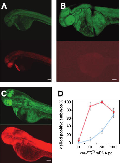 Cre-mediated recombination in the green-to-red reporter line. In Tg (ef1a: loxP-GFP-loxP-dsRed2) embryos injected with 3 pg of Cre mRNA at one-cell stage (A), dsRed fluorescence is ubiquitously observed at 36 hpf. Embryos were injected with 3 pg of CreERT2 mRNA, further incubated with embryo medium (B) or 1 μM cyclofen-OH (Ind) (C), and observed at 2 dpf. Variation of the recombination efficiency with the amount of injected CreERT2 mRNA (in pg) and inducer concentration: 0 μM (blue triangle) or 3 μM (red square). The percentage of embryos exhibiting dsRed fluorescence was scored by epifluorescence microscopy at 2 dpf (D). The error bars represent statistical errors estimated as √p(1-p)/n. Scale bars: 100 μm. dpf, days postfertilization. |