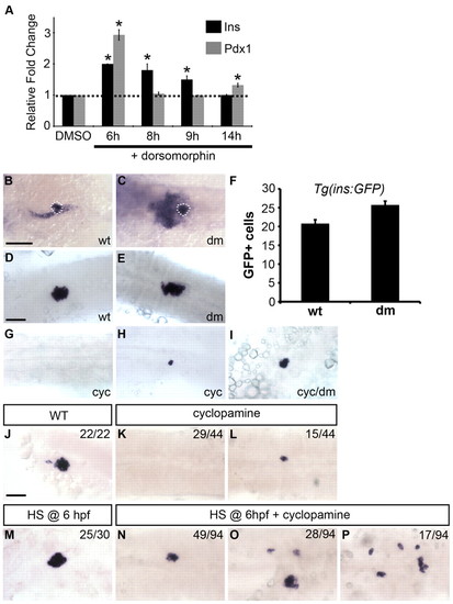 Decrease in Bmp signaling partially rescues dorsal bud-derived β-cells in Hh-deficient embryos. (A) qPCR of insulin and pdx1 expression at 24 hpf in wild-type embryos treated with dorsomorphin (15 μM) or DMSO starting at 6, 8, 9 or 14 hpf until harvest (mean ± s.e.m.). Treatment during gastrulation enhanced both pdx1 and insulin transcript levels. Asterisks indicate a significant change (at least 2 s.d.) compared with control. (B,C)The pdx1 expression domain at 24 hpf is expanded in embryos treated with dorsomorphin (dm) starting at early gastrulation (6 hpf) (C) as compared with untreated embryos (B). White dotted lines outline the dorsal pancreas. (D,E,G-I) insulin expression at 24 hpf in wild-type embryos treated with ethanol plus DMSO (D), dorsomorphin (E), cyclopamine (cyc) (G,H) and cyclopamine plus dorsomorphin (I). Treatment with dorsomorphin began at ∼6-7 hpf until harvest. (F) Quantification of Tg(ins:GFP)-expressing cells in 24-hpf embryos treated with dorsomorphin starting at 6 hpf. (J-P) Embryos obtained from outcrosses of hemizygous Tg(hsp70l:dnBmpr-GFP)w30 adult zebrafish were incubated in cyclopamine, heat shocked (HS) at 6 hpf, and examined for insulin expression at 24 hpf. In cyclopamine-treated control embryos, insulin expression was either absent (K) or severely reduced (L) as compared with wild type (J). In heat shocked Tg(hsp70l:dnBmpr-GFP)w30 embryos, insulin expression and islet size were increased (M). When Bmp activity was reduced by heat shock at 6 hpf in cyclopamine-treated embryos, insulin expression was partially rescued (N-P). Based on islet size and morphology, embryos were scored into three phenotypic classes: small cluster (N), medium cluster (O) or scattered (P). Cyclopamine (25 μM) treatments started at 2 hpf until harvest. The number of embryos displaying similar expression patterns is indicated in each case. All images are dorsal views, anterior to the left. Scale bars: 100 μm in B; 50 μm in D. |