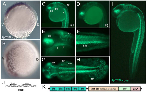 Tg(Bre:GFP) expression. (A,B) Whole-mount in situ hybridization for GFP mRNA at early gastrula stage (6 hpf), lateral (A) and ventral (B) views, dorsal towards the right. (C-I) Live images of Tg(Bre:GFP) expression, lateral views (except G, which is a dorsal view), anterior to the left. (C,D) Two stable Tg(Bre:GFP) transgenic lines (1 and 2), derived from independent insertion events, show similar expression patterns. (J) The BRE sequence includes putative Smad1- and Smad4-binding sites separated by five bases. (K) The Tg(Bre:GFP) transgenic construct includes five tandem Bres (blue-green), a minimal XId3 promoter (orange), GFP (green) and an SV40 polyA tail (red). 1, mandibular arch; 2, hyoid arch; cn, commissural neurons; de, dorsal eye; fm, fin muscle; pa, pharyngeal arches; sm, somite muscle; tm, tail mesenchyme. |