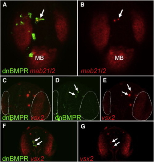 Ectopic Expression of Retinal Markers in BMP-Depleted Telencephalic Cells at 24 hpf (A–G) Embryos were injected with HSP70:dnBMPr plasmid at one- to two-cell stage followed by heat shock at oblong/early blastula stage. The arrows indicate dnBMPr-positive cells in the telencephalon at 24 hr, which ectopically express retinal markers mab21l2 (A and B) and vsx2 (C–G). The number of transiently transgenic dnBMPr cells is significantly lower at 24 hpf than at earlier stages, and the remaining transgenic cells frequently undergo apoptosis (arrows in D). (C–E) White dotted lines mark the vsx2-positive retina. All views are dorsal, anterior at the top. All figures are z-projections of confocal sections. MB, midbrain. |