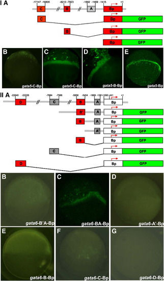Functional analysis of gata5 and gata6 regulatory modules. I. The GFP expression constructs, expression territories, and the GFP images of the gata5 regulatory module. (A) Map and summarization of the results for the gata5 regulatory modules. (B) gata5-C-Bp shows GFP in the dorsal half the embryo. (C) gata5-C-Bp shows GFP in the mesendoderm and scattered expression in the ectoderm. (D) gata5-B-Bp shows GFP in the mesendoderm and scattered expression in the ectoderm. (E) gata5-Bp shows GFP in the mesendoderm. II. GFP constructs and results for gata6 and representative images of the expression pattern. (A) Map and summarization of the results for the gata6 regulatory modules. (B) gata6-B2A-Bp shows GFP in the mesendoderm and YSL. (C) gata6-BA-Bp shows GFP in the mesendoderm. (D) gata6-A′-Bp shows no GFP expression in the embryo. (E) gata6-B-Bp shows GFP in the YSL. (F) gata6-C-Bp shows GFP in the YSL. (G) gata6-D-Bp shows no GFP expression in the embryo. |