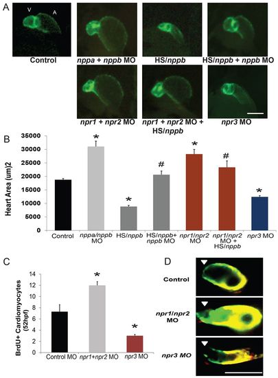 The cardiomyocyte proliferation effects of the cardiac natriuretic peptides are coordinated by the action of multiple natriuretic peptide receptors in vivo. (A) Lateral views of 48 hpf cmlc2:CFP embryos show significantly altered atrial and ventricular chamber sizes in Nppa/Nppb double knockdown and nppb overexpression embryos. Likewise, double knockdown of both natriuretic peptide guanylate cyclase-linked receptors, Npr1 and Npr2, caused a similar phenotype as the Nppa/Nppb double knockdown and could block the effect of nppb overexpression (npr1/npr2 MO + HS/nppb). Finally, the knockdown of Npr3 caused a significant reduction in both atrial and ventricular chamber sizes that was similar to that observed after overexpression of nppb. (B) Corresponding heart surface areas of all treatment groups shown in A. *P<0.05 compared with control heart size, #P<0.05 compared with HS/nppb alone. (C) Cardiomyocyte proliferation was increased in the Npr1 and Npr2 knockdown embryos, whereas Npr3 knockdown embryos had reduced cardiomyocyte proliferation at 52 hpf as assessed by BrdU labeling of cardiomyocytes. *P<0.01 compared with control. (D) Differentiation of ventricular cardiomyocytes between 30 and 48 hours of heart development was not altered by knockdown of the natriuretic peptide receptors. White arrowhead denotes arterial pole, areas of green tissue were added after 30 hpf (non-photoconverted). Yellow tissue is a mixture of photoconverted red tissue and non-photoconverted green tissue. All data are expressed as mean + s.e.m. Scale bars: 100 μm.
