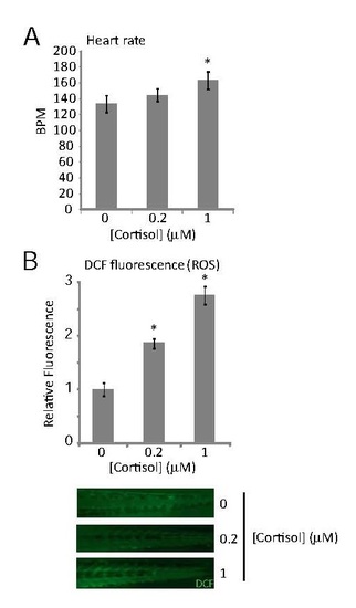 Effects of treating zebrafish embryos with the indicated doses of cortisol from fertilization up to 5 days post-fertilization (dpf) on (A) average heart rate at 3 dpf (20 larvae per sample; p = 1.54 x 10-12 by one-way ANOVA; * indicates that the difference from untreated controls is statistically significant by post-hoc Tukey’s test); and (B) reactive oxygen species levels in tail muscle, measured by backgroundcorrected DCF fluorescence at 5 dpf (5 larvae imaged per sample, in two biological replicates; p = 5.43 x 10-6 by one-way ANOVA; * indicates that the difference from untreated controls is statistically significant by post-hoc Tukey’s test). Error bars represent SEM. Example images are shown beneath the graph.