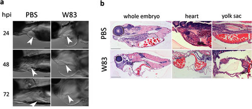 Effect of wild-type Pg W83 on zebrafish larvae tissue structure. Lateral view of impaired, elongated heart morphology of Pg W83-infected larvae; white arrowhead indicates heart. Heart chambers were distant and much smaller in comparison to PBS-injected control larvae (a). Sagittal histological sections of H&E stained 48 hpi Pg W83-infected larvae revealing advanced tissue damage in the cranial and cardiac regions along with yolk sac oedemas (b). In all figures larvae were infected with 5 × 104 CFU Pg at 30 hpf W83 or PBS as a control. At least three individual experiments were performed and images are representative of at least n = 5 larvae per group in each experiment. Scale bars = 100 μm in (a) and 200 μm in (b). |