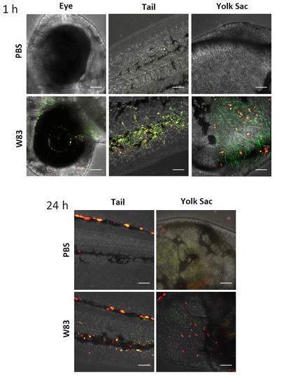 Confocal images of zebrafish larvae at 1 and 24 hpi following systemic infection with 5 x 104 CFU fluorescein and pHrodo labelled Pg W83. Small green dots represent non-phagocytosed Pg whilst small red dots are phagocytosed Pg. The large red staining in the PBS controls in the tail image is due to increased pigmentation along the back of the larvae at this stage or larvae development. Similar pigmentation was observed in the eye at 24 hpi masking the presence of Pg in this tissue and so this data is not shown. Images show the presence of less Pg in the tissues at 24 hpi with increased levels of phagocytosis. W83 Pg were injected into 30 hpf zebrafish larvae at 5 x 104 CFU in each experiment. Scale bar = 50μm. |