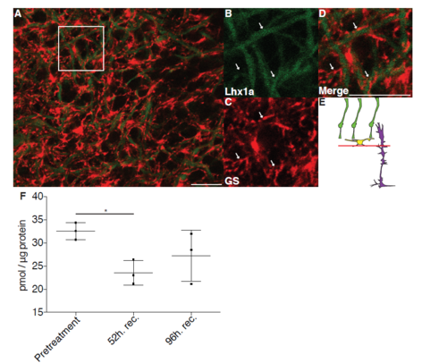 MG processes surround 44 HC processes in INL, related to Figure 4. Tg(lhx1a:EGFP)pt303 retinas were removed and stained for GS and prepared for flat mount imaging. The region of the INL where MG and HCs overlap (red line in E) was imaged. Arrows indicate regions of close association between MG and HCs. Scale bar is 100μm. Tg(zop:nfsb-EGFP)nt19 fish were treated with MTZ and allowed to recover. Whole retinas were removed at indicated time points and subjected to HPLC. Levels of GABA were measured (F, related to section MG are poised to detect changes in GABA levels). A one-way ANOVA was used; n=3 biological replicates for each timepoint; Error bars = SD; * = p<0.05. |