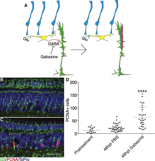 Gabazine Injections Cause Time-Dependent Spontaneous Proliferation in Undamaged Retinas (A) Model illustrating effects of gabazine injection on MG proliferation. (B and C) Wild-type eyes were injected with PBS (B) or 12.5 nmol gabazine (C) into one eye. Fish recovered for 48 hr after gabazine injections before proliferation was measured. Representative images are small portions of entire retina. Scale bar, 100 μm. (D) Proliferating cells were counted across whole sections by PCNA staining for pretreatment (n = 16 eyes analyzed), PBS injection (n = 40), and gabazine injection (n = 31). hpi, hours post injection. One-way ANOVA was used; error bars denote SD; ∗∗∗∗p < 0.0001. |
