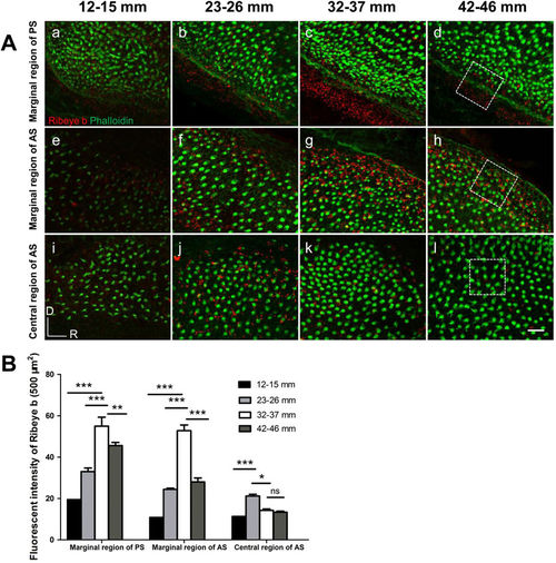Representative images of Ribeye b staining in distinct regions of different TL groups. (A) The ventral marginal region of the posterior saccule (a–d), the dorsal marginal region of the anterior saccule (e–h), and the central region of the anterior saccule (i–l), corresponding to regions 8, 1 and 3, respectively, as labelled in Fig. 3C. White dotted rectangles: the areas used for fluorescence intensity analysis, which is presented in B. (B) TL (age)-related changes in the fluorescence intensity of Ribeye b protein immunolabelling in three regions. An increase in the fluorescence intensity of Ribeye b immunolabelling was visible in the two marginal regions (regions 1 and 8) from the 12–15 mm TL group to the 32–37 mm TL group (a–c and e–g), followed by a decrease in the 42–46 mm TL group that was accompanied by a decrease in HC density (d,h). In the central region (region 3), a decrease in fluorescence intensity was observed in the 32–37 mm TL group (k compared to j). The asterisks indicate the significance of the differences within each region across different TL groups based on ANOVA followed by post hoc tests. *P < 0.05, **P < 0.01, ***P < 0.001. |