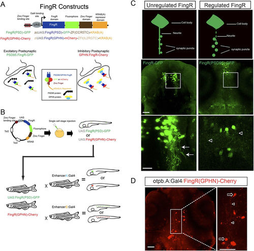 FingR constructs and testing in zebrafish. (A) Schematic diagram of FingR constructs used to generate plasmids and transgenic lines. FingR(PSD95)-GFP binds endogenous PSD-95 protein at the post-synaptic density; FingR(GPHN)-Cherry binds endogenous GPHN. (B) Use of inducible Gal4/UAS system with FingR(GPHN) or FingR(PSD95) in different Gal4 lines for differential synapse labeling (drawn by JHS). (C) Contrasting examples of unregulated (FingR-GFP) and regulated (FingR(PSD95)-GFP) FingR plasmids injected into Tg(otpb.A.Gal4) embryos. GFP signal from the unregulated FingR is distributed throughout the neuron and neurites (arrows) and individual synaptic puncta are not visualizable. In contrast, distinct puncta are seen (open arrowheads) using regulated FingR expression. Confocal images, scale bar 50 μm, 10 μm in inset panels; confocal z-stacks, ventral views, rostral to the top. D) Demonstration of puncta labeling with regulated FingR for GPHN. Confocal z-stacks, ventral view, rostral to top, of Tg(otpb.A:Gal4) embryo injected with FingR(GPHN)-Cherry. Arrows, neuron soma; arrowheads, puncta. Scale bar 50 μm, 10 μm in inset panel. |
