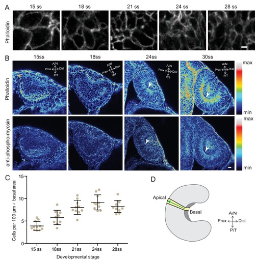 Analysis of the basal surface and actomyosin localisation during RNE invagination. (A) Confocal scans of the basal side of the RNE cells stained with phalloidin at different developmental stages.Scale bar = 2 µm. (B) Confocal scans of different stages of RNE morphogenesis stained for phalloidin and phosphomyosin. Arrowheads point at basal enrichment. Lookup table indicates the minimum and maximum intensity values. Scale bar = 10 µm. (C) Average number of cells per 100 µm2 basal area of RNE at different stages of development. Mean ± SD, N = 10 embryos each. See Figure 1—source data 1. (D) Schematic drawing of a typical tissue volume used for actomyosin intensity distribution analysis (yellow). The average intensity was measured from basal to apical side of the tissue volume (green arrow) and normalised to the highest intensity value along the axis. See Materials and methods for details. |
