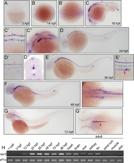 Expression analysis of zebrafish npr3. (A) 3 hpf, lateral view, no staining. (B) 14 hpf, lateral view, weak staining. (B′) 14 hpf, dorsal view, weak staining. (C, C′) 18 hpf, lateral view, red arrowhead indicates floor plate; green arrowhead indicates hypochord. (C″) 18hpf, dorsal view, arrowhead indicates proximal convoluted tubule. (D, D′) 24 hpf, lateral view, red arrowhead indicates floor plate; green arrowhead indicates hypochord. (D″) 24 hpf, the trunk transverse section of the embryos stained with the antisense npr3 probe, red arrowhead indicates floor plate; green arrowhead indicates hypochord. (E, E′) 36 hpf, lateral view, red arrowhead indicates floor plate; green arrowhead indicates hypochord. (F) 48 hpf, lateral view. (F′). 48hpf, lateral view, arrowhead indicates proximal convoluted tubule. (G) 72 hpf, lateral view. (G′) 72 hpf, dorsal view, arrowhead indicates floor plate. (H) Reverse transcriptase-PCR analysis of zebrafish npr3. |