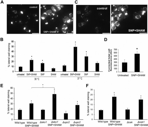 SNP+SHAM treatment induces surface exposure of chitin and β(1,3)-glucan. (A) Representative examples of untreated cells and cells treated with 1 mM SNP–0.5 mM SHAM for 18 h, stained with fluorescein isothiocyanate (FITC)-wheat germ agglutinin (WGA), and analyzed using fluorescence microscopy. (B) Cells treated with SNP, SHAM, or SNP+SHAM at 30 or 37°C were quantified for FITC-WGA staining as described in Materials and Methods ( |