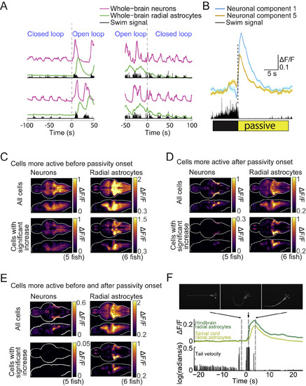 Whole-Brain Activity Elevation before and after Passivity Onset in Both Paralyzed and Non-paralyzed Fish and Passivity in Non-paralyzed Fish, Related to Figure 2 (A) Neuronal and astrocytic activity near the time of open-loop onset (left), and closed-loop onset (right). Signals are averaged across all the neurons or all the radial astrocytes in the brain, and two switches from each type are shown (top and bottom). Neurons showed stronger activity fluctuations during open-loop than during closed-loop, but showed clear activity patterns in both scenarios. In contrast, astrocytic activity fluctuations (calcium) were small before open-loop, but increased before and during passivity. Signals are z-scored. (B) Average activity of neuronal component 1 and component 5, from the same fish in Figure 2H, triggered by passivity onset. Each trace is the average of 42 switches from active to passive states. Shading represents SEM. (C–E) Whole-brain neuronal and astrocytic maps for cells showing activity elevation in windows before, after, or both before and after passivity onset (average over 5 fish for neuronal imaging, 6 for astrocytic imaging). Average ΔF/F signals from cells statistically increasing their activity relative to baseline (Methods), (C) before passivity onset (−1 to 0 s). (D) after passivity onset (+1 to 4 s). (E) both before and after passivity onset (−1 to 0 s and +1 to 4 s). For each panel, top rows show average activity from all cells, and bottom rows show average activity only from cells with significant activity elevation. (F) A zebrafish, expressing GCaMP6f in radial astrocytes, was placed in agarose. The agarose was slowly coagulating, but never fully prevented tail motion. The fish attempted to swim and the viscous agarose prevented the movement, qualitatively mimicking a reduction in motosensory gain. The animals displayed similar passivity as in the virtual reality assay. Calcium levels followed a similar pattern as was seen in futility-induced passivity in virtual reality. Calcium activity also increased in the spinal cord, but with a delay. |