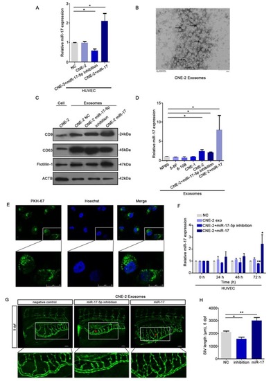 HUVECs ingested NPC derived exosomal miR-17-5p to promote angiogenesis. A: Real-time PCR analysed miR-17-5p expression in HUVECs which was co-cultured with CM from CNE-2 cells. B: Representative electron microscopy image of exosomes. C: Western blot showed the level of different kinds proteins in exosomes and CNE-2 cells. Flotillin-1 was the loading control. D: MiR-17-5p expression in exosomes was detected by Real-time PCR. E: Confocal microscopy images showed the ingestion of PKH67-labeled exosomes by HUVECs. Hoechst stained the nuclei (blue) and PKH67 labeled the exosomes (green). F: Real-time PCR showed miR-17-5p expression in HUVECs after absorbed exosomes from CNE-2 cells. (G-H): Morphology of SIVs in 5 dpf Tg(fli1a:EGFP) embryos injected with CNE-2 derived exosomes.
