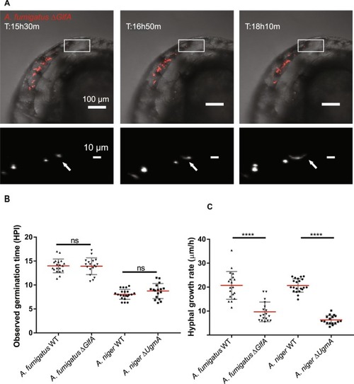 Timelapse microscopy based in vivo analysis of germination and growth rate phenotypes in galctofuranose deficient Aspergillus mutant strains. (A) Example of time-lapse microscopic assessment of hyphal growth-rate after injection of 150 conidia of the A. fumigatus ∆glfA mutant, in a pu.1 morphant embryo. Upper panels show bright field images overlaid with the red fluorescent channel. The lower panel shows a blow-up of a specific area, marked in the upper panels, from the red fluorescent channel with signal in white. Individual confocal stacks of parallel time lapse acquisitions were analyzed to estimate hyphal growth rates. (See also Supplementary Movies SM10–13). (B) Analysis of germination time in confocal stacks of time-lapse microscopy experiment comparing A. fumigatus and A. niger WT to their respective Galf deficient mutant strains at an infectious burden of approximately 150 conidia. No statistically significant difference could be detected between WT and galf deficient strains in either species. (C) Analysis of approximate hyphal growth rate from confocal stacks. Plots derived from 17–21 independent hyphal growth measurements in 7–8 different pu.1 morphant embryos from three independent biological replications each. The galactofuranose deficient mutants of both Aspergillus species exhibit significantly reduced rates of hyphal elongation in vivo. (B,C) Each scatterplot depicts the 17–21 data points generated from 7–8 individual pu.1 morphant embryos covering three biological replications of each species and genotype. ****p ≤ 0,0001 by unpaired t test with Welsh correction.