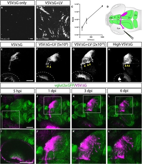 Lentivirus enabled in vitro and in vivo trans-complementation of VSVΔG and transneuronal spread. (A–C) Lentivirus trans-complementation in vitro. (A) VSVΔG was able to infect 293T cells but was unable to spread to neighboring cells, as evident by sparse single-cell infections. (B) In conjunction with lentivirus, VSVΔG was able to both infect and spread, as evident by the presence of large infected plaques. (C) The extent of VSVΔG amplification (as measured by viral titer) is positively correlated with lentivirus titer, expressed in m.o.i. (D) Illustration of viral injection and labeling of the optic nerve. Virus was microinjected into the left eye, which infected the RGC and resulted in fluorescent labeling of the RGC axons (magenta). The layout of the larval CNS is labeled in green, with the olfactory bulb (OB), pallium (P), habenula (H), optic tectum (OT), and cerebellum (Cb) labeled. (E–H)In vivo trans-complementation of VSVΔG by lentivirus. In the absence of lentivirus, VSVΔG infected RGCs and fluorescently labeled the optic nerve, but no spread in the CNS was observed (E). (F,G) When lentivirus and VSVΔG were coinjected, cellular labeling was observed in the CNS (yellow arrowheads), indicating transneuronal spread. (H) Similar patterns of spread was also seen at very high VSVΔG titer (2 × 109 vs. 108 ffu/ml for E–G), suggesting that VSVΔG was able to self-complement. (I–L) Time course of VSVΔG infection and spread with lentivirus trans-complementation, with RFP expression from VSVΔG (magenta) and GFP expression from the vglut2a:GFP transgene (green). Box regions are shown at higher magnifications below (I'–L'). Scale bars are 100 μm. Images in the same row are shown at the same scale.