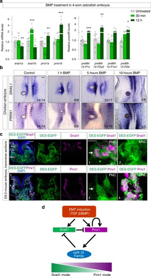 Snail1 and Prrx1 are sequentially expressed during EMT. a qPCR assay showing the expression of prrx1a/b and snail1a/b (left) and premiRNAs (right) in zebrafish embryos after different treatments with BMP (n = 8). Asterisks indicate significant p value in one-way ANOVA with Bonferroni’s multiple comparison test compared to the control. (*p < 0.05, **p < 0.01 and ***p < 0.001). Source data are provided as a Source Data file. b Dorsal view of HH9 chicken embryos showing SNAIL1 and PRRX1 expression in control embryos and at different times after BMP-soaked bead implantation. c Transverse sections of E8.5 DES-EGFP reporter mouse embryos showing IFs for GFP and Snail1 (upper panel) or Prrx1 (lower panel). Insets show higher magnification pictures for GFP and Snail1 (1 and 2), or for GFP and Prrx1 (3 and 4). d Schematic model of the gene regulatory network. DES downstream enhancer of Snail1, PNC premigratory neural crest shown by arrows, MNC migratory neural crest. Scale bars: 100 μm. Scale bars: 100 μm for sections and 10 μm for insets (boxes 3–4)