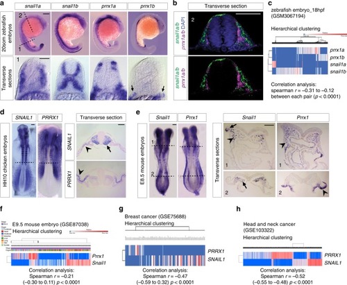 Snail1 and Prrx1 complementary expression in development and disease. a Lateral view of 20-somite zebrafish embryos showing snail1a, snail1b, prrx1a and prrx1b expression in whole-mount (top) and transverse sections (1), showing complementary patterns in somites. b Transverse section of a zebrafish embryo in the cranial neural crest region showing complementary expression of snail1a/b (green) and prrx1a/b (red) taken at the level indicated by (2) in (a) with or without DAPI staining (nuclei). c Heatmap showing hierarchical clustering of scRNA-seq data from 18 hpf zebrafish embryos, from public database GEO: GSM3067194, with significant negative correlations between gene pairs (detailed in Supplementary Fig. 1a). d Dorsal view of HH10 chicken embryos showing PRRX1 and SNAIL1 expression in whole-mount and transverse sections at the level indicated by dashed lines, showing complementary patterns for SNAIL1 and PRRX1 In the somites (arrow) and in the LPM (splanchnopleura and somatopleura, respectively; arrowheads). e Expression of Snail1 and Prrx1 in dorsal views of E8.5 mouse embryos. Transverse sections of E8.5 embryos from the regions indicated by dashed lines (anterior and posterior, 1 and 2, respectively), showing complementary expression of Snail1 and Prrx1 in premigratory (1, arrow), and migratory (1, arrowheads) neural crest (PNC and MNC, respectively) and mesodermal populations including presomitic mesoderm (2, arrow) and lateral plate mesoderm (2, arrowhead). f Hierarchical clustering heatmaps of scRNA-seq data from E9,5 mouse embryos for Snail1 and Prrx1 expression (GEO: GSE87038), showing a significant negative correlation. This dataset contains cells from different embryonic tissues, shown in different colors. g, h Heatmaps of hierarchical clusterings of single-cell RNA sequencing data from public datasets of breast (GEO: GSE75688) and head and neck carcinoma (GEO: GSE103322), showing mutually exclusive expression of Snail1 and Prrx1. The color scale shown in (f) is also valid for (g) and (h), representing the normalized values for the number of reads. Scale bars: 250 μm for whole mounts and 100 μm for sections. Statistical analyses for scRNA-seq data has been done using Spearman r correlation test, scRNA-seq single-cell RNA sequencing, vs. versus, hpf hours post fertilization. Source data are provided as a Source Data file