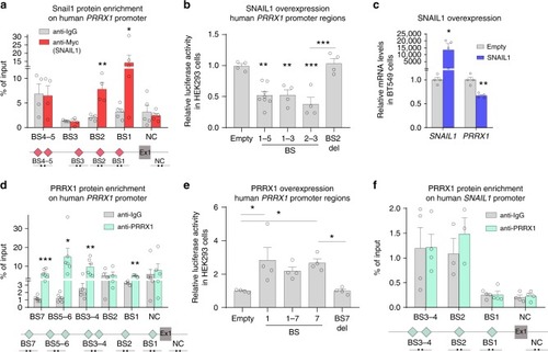 SNAIL1 and PRRX1 act antagonistically on PRRX1 promoter. a Snail1 enrichment in the human PRRX1 promoter shown by ChIP assay in BT549 cells, using anti Myc antibody (for Snail1-Myc overexpression). A schematic map is shown; red diamonds represent SNAIL1 potential binding sites (E-boxes; CANNTG) on PRRX1 promoter. (BS1: –1689, BS2: −4102, BS3: −6753, BS4: −7277, BS5: −7318 and NC: +104560). Ex1: PRRX1 exon 1 (n = 4). b Activity of different regions of the human PRRX1 promoter after SNAIL1 transfection assessed by luciferase assays in HEK293 cells (n = 4, except for BS1–5 for which n = 8). c qPCR assay showing downregulation of PRRX1 transcription upon SNAIL1 transfection in BT549 cells (n = 4). d PRRX1 directly binds to its own promoter, as assessed by ChIP assays in BT549 cells using a PRRX1 specific antibody. A schematic map is shown; cyan diamonds represent PRRX1 potential binding sites (TAATKDS) on its own promoter. (BS7: −6875, BS6: −5579, BS5: −5202, BS4: −4147, BS3: −4096, BS2: −1653, BS1: −1197 and NC: +104560). Ex1: PRRX1 exon 1 (n = 6, except for BS1–2 for which n = 4). e Activity of different regions of the human PRRX1 promoter after PRRX1 overexpression in luciferase assays in HEK293 cells (n = 4). f Lack of enrichment for PRRX1 binding to human SNAIL1 promoter assessed by ChIP assays in BT549 cells (BS4–1: −1753, −1621, −954, −198, and NC: +11799). Ex1: SNAIL1 exon 1 (n = 4). Locations of red and cyan diamonds represent distances between BSs and the promoter. Arrows represent primers used for qPCR amplification. BS biding site, NC negative control region, which does not contain potential BSs. Symbols in binding sites are as follows. K: T/G, D: G/A/T, S: G/C and N: G/A/T/C. Bars represent mean plus standard error of the mean (SEM), indicated (n) represent number of independent experiments as biological replicates and asterisks indicate significant p value in t test compared to the control in each test for (a), (e), (d), (f) and ANOVA with Bonferroni’s multiple comparison test for (b), (e) (*p < 0.05, **p < 0.01 and ***p < 0.001). Source data are provided as a Source Data file