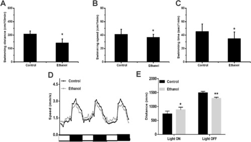 Effects of ethanol exposure on zebrafish locomotor activity. After exposure to alcohol, we investigated the behavior of 120 hpf zebrafish larvae. |