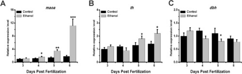 Neurotransmitter metabolism gene expression patterns in zebrafish larvae after ethanol exposure. Samples were taken at 3, 4, 5, and 6 dpf. The expression patterns of |