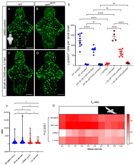 CNS neuroinflammation in sgshΔex5−6 larvae is corrected by continuous pharmacological Caspase-1 blockade. (A,B) L-plastin immunostaining of microglia in 7 dpf wild type and sgshΔex5−6 brains from larvae continuously treated from 3–7 dpf with 0.1% DMSO as control. (C,D) L-plastin immunostaining of microglia in 7 dpf wild type and sgshΔex5−6 brains from larvae continuously treated from 3–7 dpf with 50 µM Ac-YVAD-cmk Caspase-1 inhibitor. Scale bars 50 µm. (E) Quantification of L-plastin+ microglial morphology and abundance following treatment with either 50 µM Ac-YVAD-cmk or 0.1% DMSO in wild type and sgshΔex5−6 larval brains at 7 dpf. Each point represents a single brain. Data presented as mean ± SEM and tested by ordinary one-way ANOVA with Tukey’s multiple comparisons test; **** p < 0.0001, n.s. p > 0.05. (F) Neither YVAD nor DMSO exposure significantly alters basal movement (cumulative distance travelled, mm, in constant illumination) in either wild type or sgshΔex5−6 7 dpf larvae. Data presented as mean ± SEM and tested by one-way ANOVA with Tukey’s multiple comparisons test; n.s. p > 0.05. (G) Chronic YVAD administration to sgshΔex5−6 partially rescues impaired thigmotaxis behaviours under standard conditions (white boxed region, representing constant levels of light), but does not attenuate the impaired escape response in response to sudden threat conditions (black boxed region, representing sudden switching off of light and resulting darkness). Data presented as heat map reflecting relative mean Tw (wall preference ratio) metric at specific time point of sample recording. Data were analysed by two-way ANOVA with stacked matching, where sphericity of variances was not assumed and α = 0.05. The treatment condition was found to represent 47.43% of variation in the dataset, p < 0.0001. Each group represents mean values of 18 replicate trials per each condition.