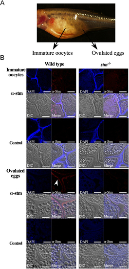 Immunohistochemical observation of Stm. (A) A photograph of stm−/− mutant females possessing ovulated eggs. Frozen sections of immature oocytes and ovulated eggs were prepared from the fish. (B) Immunohistochemical staining results for Stm in WT and in stm−/− mutant immature oocytes (upper panel) and ovulated eggs (lower panel). Frozen sections of the whole bodies of WT and stm−/− mutant zebrafish females were stained with anti-Stm antibodies (α-stm) and DAPI. Differential contrast (DIC) images and merged images of anti-Stm, DAPI and DIC are also indicated (Merge). Control staining (Control) without anti-Stm antibodies of each sample is indicated below. The white arrow indicates signals in anti-Stm staining. The scale bars indicate 50 µm.