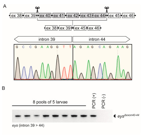 Characterization of the stable eysΔexon40-44 zebrafish line. (A) Schematic representation of exon excision approach (upper panel). Sanger sequencing confirmed the presence of the anticipated exons 40-44 excision in injected embryos (1 day post fertilization (dpf)); lower panel). (B) PCR analysis identified germline transmission in 8 out of 8 pools of 1 dpf embryos obtained by breeding an injected adult with a wild-type animal. PCR (+): positive PCR control, PCR (-): negative PCR control. |