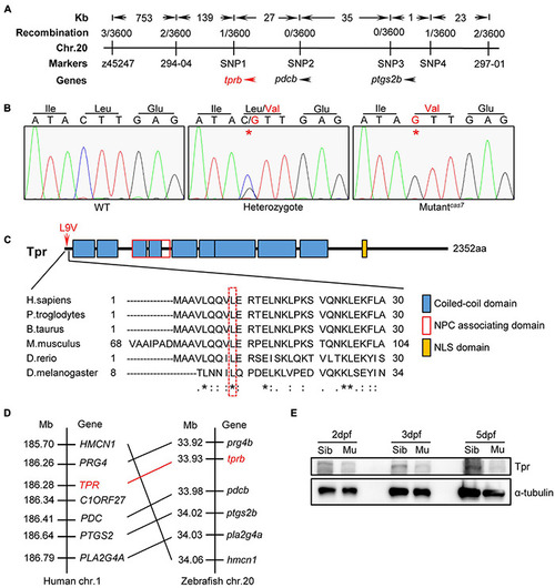 Positional cloning of mutantcas7. (A) Genetic mapping of the cas7 region on chromosome 20. Bulk segregation analysis positioned cas7 mutation to Chr. 20. Fine mapping using SSLPs narrowed down the region between markers SNP1 and SNP4, including tprb and two other genes as indicated. (B) There is a C-to-G missense mutation in tprb gene in mutantcas7, which leads to leucine to valine (L9V) at ninth amino acid in Tpr protein. (C) The ninth amino acid leucine of Tpr is highly conserved from human to fruit fly (* marked). (D) Comparison of the gene syntenic relationship between zebrafish tprb and human TPR loci. Seven genes, including TPR, are located within a genomic region on human chromosome 1. (Right) Seven zebrafish homologs of these genes are listed according to their map positions on chromosome 20 (Ensembl website). Mb, mega base. (E) Western blotting images of Tpr protein in whole embryo lysates of sibling and mutantcas7 embryos at the indicated time. All embryos were extracted for genomic DNA and genotyped by sequencing. |