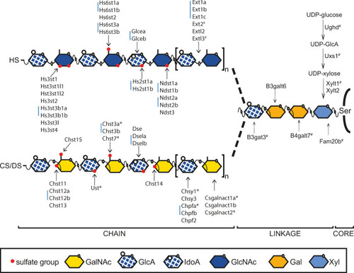 Heparan sulfate (HS) and chondroitin/dermatan sulfate (CS/DS) biosynthesis in zebrafish.