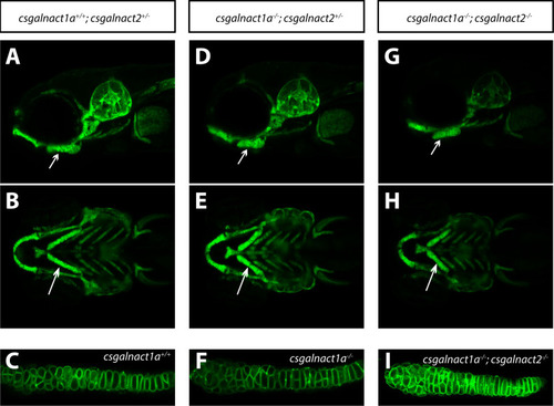 Craniofacial malformations in csgalnact1a-/- and csgalnact1a-/-; csgalnact2-/- larvae.