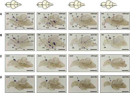 ish with ddc or asmt probe on opn4 dko mature brains show wild‐type expression patterns A, B Same ddc expression pattern was observed in wild‐type (A) and opn4 dko (B) brains (pineal lost from the brain slices in (B) centre panels). C, D asmt expression in wild‐type (C) and opn4 dko (D) adult brains show that asmt is not ectopically expressed. Thus, the higher asmt transcript level measured with qPCR in the opn4 dko anterior brain can be attributed to the pineal. Data information: The horizontal line through a representation of the brain, above the section, indicates the location of the section within the brain. Abbreviations: epiphysis cerebri (pineal) [E], caudal zone of periventricular hypothalamus [Hc], inferior raphe [IR], periventricular pretectum [Pr], preoptic area [PO], posterior tuberculum [PT], paraventricular organ [PVO], suprachiasmatic nucleus [SCN], superior raphe [SR]. Note that the duration of the colorimetric development of the ishs in this figure is not exactly the same. Scale bar: 1.0 mm. |