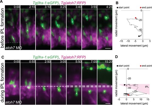 (A–D) Representative time series of tracked horizontal cells (HCs) (white dot) and their respective trajectories in atoh7 MO retinae at different developmental stages: before inner plexiform layer (IPL) formation (A–B), and after maturation of IPL (C–D). Tg(lhx-1:eGFP) labels HCs (green), Tg(atoh7:RFP) labels membranes of photoreceptors (PRs) and basal neurons (magenta). (A) Before IPL formation, HCs successfully move toward the HC layer even when moving from more basal positions close to the lens. (B) Radial-tangential migration trajectories of the tracked HC from (A). See Figure 6—source data 1. (C) After IPL formation, HCs fail to move through the formed IPL and therefore remain ectopically trapped beneath the IPL. (D) Radial-tangential migration trajectories of the tracked HC from (C). See Figure 6—source data 1. Line: apical surface; dashed line: forming IPL (B). Scale bar: 10 μm. Time in h:min. (A,C).