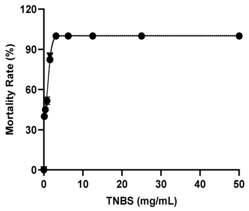 Effect of TNBS at concentrations of 0.2–50 mg/mL on zebrafish larvae (12 dpf) mortality rate. The LC50 value of TNBS was 0.60 mg/mL. |