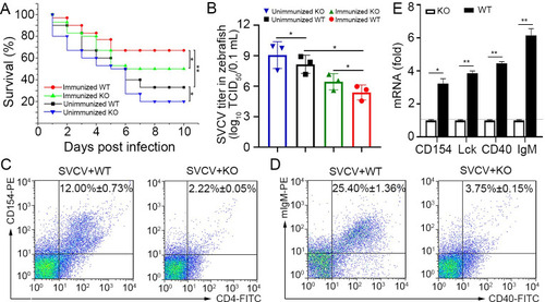 (A) The functional role of Env38 was verified by the impairment of the antiviral activity of Env38-/- zebrafish after vaccination with formaldehyde-inactivated SVCV vaccine or infection with live SVCV. In both wildtype and knockout zebrafish, the immunized groups were i.p. inoculated with vaccine derived from 0.4% formaldehyde-inactivated SVCV (106 TCID50) and then challenged with SVCV (105 TCID50); whereas the unimmunized groups were challenged with SVCV (105 TCID50) without vaccination. Data points were from three independent experiments, and 30 zebrafish were used in each experiment (n = 30). Differences were analyzed using log-rank test. (B) Viral titer (TCID50) was measured to evaluate the viral load in the wild type and knockout zebrafish with or without vaccinated immunoprotection. Viral samples were prepared from zebrafish at 4th day post SVCV (105 TCID50) infection. The TCID50 was examined in EPC cells by using Reed-Muench method. Viral titers were log10 transformed prior to statistical analysis. Data points were from three independent experiments, and three zebrafish were used for viral sample preparation in each experiment (n = 3). (C and D) The degree of CD4+ T and IgM+ B cell activation between WT and KO zebrafish under SVCV (105 TCID50) stimulation was represented by the percentage of CD4+CD154+ T and IgM+CD40+ B cells with mouse anti-CD154 (1:500), rabbit anti-CD4 (1:500) (C) and mouse anti-mIgM (1:2,000), rabbit anti-CD40 (1:500) (D) through determination with FCM analysis. The data presented in each block diagram indicated the average percentage of CD4+CD154+ T and IgM+CD40+ B cells in WT and KO zebrafish. (E) The degree of CD4+ T or IgM+B cell activation between WT and KO zebrafish under SVCV (105 TCID50) stimulation was represented by the transcriptional levels of cd154, lck, cd40 and IgM through RT-qPCR. The RT-qPCRs were run in combination with the endogenous β-actin control. Error bars represented SEM. (*p < 0.05; **p < 0.01; ***p < 0.001; ns, no significant difference). |