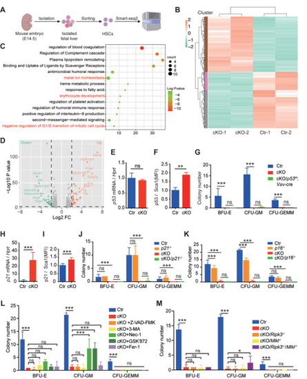 Inhibiting necroptosis partially restores the colony‐forming capacity of Slc39a10‐deficient HSCs. A) Schematic diagram depicting the strategy of sorting fetal LT‐HSCs from control and cKO embryos at E14.5 and performing RNA‐seq analysis. B) Heat map showing genes that are differentially expressed between fetal LT‐HSCs obtained from control and cKO mice; downregulation and upregulation (defined as a log2 fold change >1 or <−1 and p < 0.05) are shown in green and red, respectively. C) Gene Ontology (GO) analysis of the RNA‐seq data showing the top 15 enriched pathways in fetal LT‐HSCs between control and cKO mice (defined as a log2 fold change >1.3 or ←1.3 and p < 0.05). The pathways involved in metal ion homeostasis, erythrocyte development, and negative regulation of G1/S transition of the mitotic cell cycle are written in red. D) Volcano plot of the RNA‐seq data, showing the differentially expressed genes in fetal LT‐HSCs between control and cKO mice. The green and red dots indicate significantly downregulated and upregulated genes (defined as a log2 fold change >2 or <−2 and p < 0.05) respectively, while gray dots indicate genes that were not significantly upregulated or downregulated; the p21 gene is indicated. E,F) Summary of normalized p53 mRNA (E) and p53 protein (F) levels measured in LT‐HSCs obtained from control and cKO embryos at E14.5 (n = 5 and 3 for the mRNA and protein groups, respectively). G) In vitro colony assays were performed using fetal livers obtained from control, cKO, and Slc39a10fl/fl; p53fl/fl; Vav‐Cre+ double‐knockout embryos at E14.5; colony numbers were measured on day 12 (n = 4 per group). H‐I, Summary of normalized p21 mRNA (H) and p21 protein (I) levels measured in LT‐HSCs obtained from control and cKO embryos at E14.5 (n = 5 and 3 for the mRNA and protein groups, respectively). J,K) In vitro colony assays were performed using fetal livers obtained from control, cKO, cKO/p21−/‐ (J), and cKO/p16−/‐ (K) embryos at E14.5; colony numbers were measured on day 12 (n = 4 per group). L) Summary of CFUs formed by untreated control and cKO FL‐HSCs and cKO FL‐HSCs treated with 50 µm Z‐VAD‐FMK, 100 µm 3‐MA, 10 µm necrostatin‐1 (Nec‐1), 2.5 µm GSK’872, or 30 µm ferrostatin‐1 (Fer‐1) (n = 4 per group). M) Summary of CFUs formed by LT‐HSCs obtained from control, cKO, cKO/Ripk3−/−, cKO/Mlkl−/−, and cKO/Ripk3−/−/Mlkl−/− embryos at E14.5 (n = 3 per group). Data in this figure are represented as mean ± SD. The data in (E–I) were analyzed using a 2‐tailed, unpaired Student's t‐test, and the data in (J–M) were analyzed using a one‐way ANOVA with Tukey's post hoc test (for multi‐group comparisons). *p < 0.05; **p < 0.01; ***p < 0.001, and ns, not significant.
