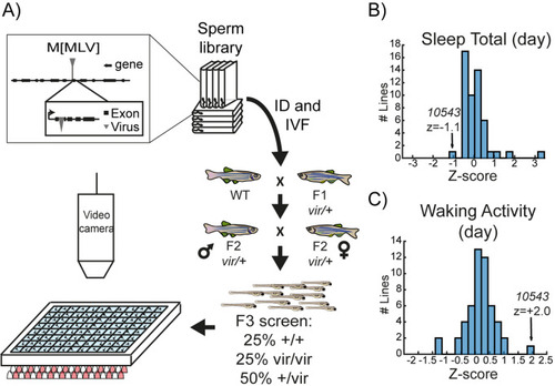 A viral insertion screen for sleep-wake regulators. (A) Schematic of screening strategy. Candidate genes were selected from a list of 904 mammalian genes encoding protein classes most often linked to behavioural regulation, including (1) genes previously implicated in sleep and circadian rhythms; (2) G-protein coupled receptors; (3) neuropeptide ligands; (4) channels; and (5) proteins involved in post-translational regulation, such as de-ubiquitinating enzymes (Figure 1—source data 1). tBLASTN of the human protein sequences identified 1162 zebrafish orthologs (Zv6), of which 702 (60.4%) had viral insertions mapped in the ‘Zenemark’ zebrafish viral insertion library (Varshney et al., 2013). Sperm harbouring viral insertions in 26 loci were successfully used for in vitro fertilisation and propagated to the F3 generation for screening. F3 larvae from single family F2 in-crosses were monitored on a 14 hr:10 hr light:dark cycle from 4 to 7 dpf using videography and genotyped at the end of the experiment. (B, C) Histogram of total daytime sleep (B) and average daytime waking activity (C) normalised as standard deviations from the mean (Z-score) of all the viral-insertion lines tested (including heterozygous vir/+ and homozygous vir/vir). Line 10543 (renamed dreammist) exhibited decreased daytime sleep and increased daytime waking activity.