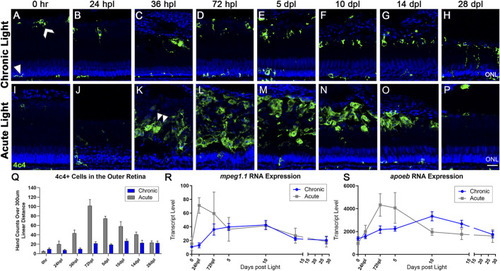 The microglial response to CLL is muted in comparison to AL damage. Anti-4c4 antisera (green) was used to immunolabel microglia and nuclei were stained with TO-PRO-3 (blue). (A) At rest, microglia exhibited two distinct morphologies. Within the ONL and plexiform layers, the microglia were ramified with thin projections (white arrowhead). In the outer retina, microglia resided at the outer margin of the ROS/RPE boundary in an activated state, exhibiting a slightly larger morphology with fewer projections (white chevron). (A–H) Over 28-day CLL exposure, we observed a slight increase in the microglia inflammatory response in the outer retina. (D) At 72 hpl, microglia accumulated at the tips of the truncated ROS (Figure 2). (H) At 28 dpl, we also observed some microglia interdigitating with ROS. (I–P) Microglia response in the AL damage model. (K) Microglial infiltration corresponded directly to peak PR damage in the AL model, with the first evidence of microglia with amoeboid morphology occurring at 36 hpl (double arrowhead). (M) The peak of microglial presence in the outer retina occurred at 72 hpl, corresponding to the completion of the debris clearance of cones, and significant consolidation of the ROS debris field. (Q) 4c4+ cell hand counts in the outer retina (not including ONL) over a 300 µm linear distance. In the CLL model, the only time-point with significantly higher 4c4+ cells in the outer retina as compared to 0 h is at 10 dpl (p < 0.011). In the AL model, there was a significant increase in 4c4+ cells for all time-points from 36 hpl–14 dpl (p < 0.041-p<0.001). (R,S) Gene expression changes in two microglia-associated genes (mpeg1.1 and apoeb) in CLL vs. AL damage models displayed as transcript pseudocounts from 3′mRNA-seq of individual retinas. In the AL model, we observed an early acute increase in these genes in a peak from 24 hpl to 5 dpl that preceded the observed increase in immunolabeled microglia. In the CLL model, the pattern of gene expression followed a similar pattern, only the peak occurred later, at 10 dpl and the wave was longer in duration. (ONL = outer nuclear layer; scale bar in panel P = 5 µm).