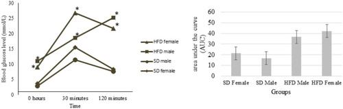 Glucose tolerance test (GTT) and area under the curve (AUC) of male and female zebrafish fed an HFD versus SD. Blood glucose levels were measured after fasting for 0, 30, and 120 min, and following an oral dose of 1.25 mg glucose/g body weight; Values are means (± SD), (* |