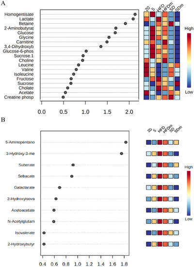 The VIP values were derived from PLS-DA of aqueous (A) and lipophilic (B) metabolites of diabesity male zebrafish. HFD high fat diet, SD stander diet, 20 20 mg/L, 5 5 mg/L, HFDm high fat diet methanol, SDm stander diet methanol.